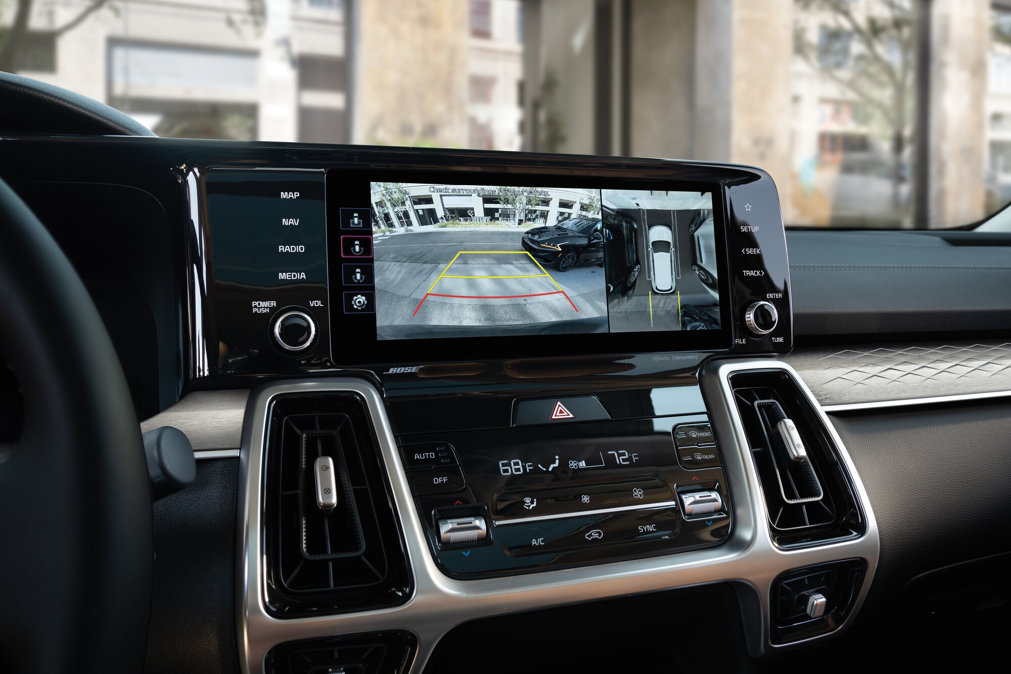 To ensure your safety, Kia has outfitted the Sorento with plenty of standard and optional driver-assistance technology. Standard features include forward collision warning, lane-keeping assist, and a blind-spot monitor. While higher trims offer adaptive cruise control, a lane-centering system, and a 360-degree camera system.