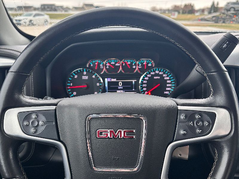 Bluetooth technology is built into this vehicle, keeping your hands on the steering wheel and your focus on the road. An off-road package is equipped on this model. Never get into a cold vehicle again with the remote start feature on this vehicle. It offers Automatic Climate Control for personalized comfort. Protect this unit from unwanted accidents with a cutting edge backup camera system. This 1/2 ton pickup features steering wheel audio controls. The GMC Sierra has a V8, 5.3L high output engine. This GMC Sierra has four wheel drive capabilities. Maintaining a stable interior temperature in it is easy with the climate control system. With the keyless entry system on this unit you can pop the trunk without dropping your bags from the store. Keep safely connected while in this unit with OnStar. You may enjoy services like Automatic Crash Response, Navigation, Roadside Assistance and Hands-Free Calling. The GMC Sierra is painted with a sleek and sophisticated black color.