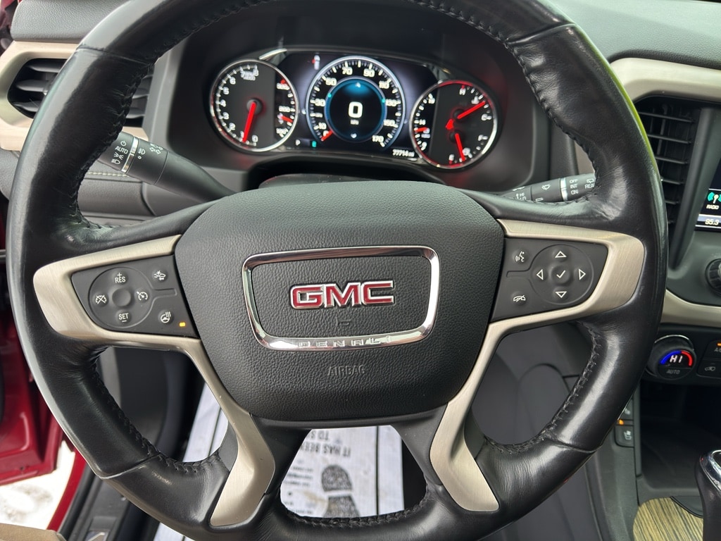 The leather seats in this 2019 GMC Acadia are a must for buyers looking for comfort, durability, and style. See what's behind you with the back up camera on this unit. This vehicle features a hands-free Bluetooth phone system. This unit is pure luxury with a heated steering wheel. Lane Keep Assist in the vehicle helps maintain safe driving by gently steering to stay within the lane. The installed navigation system will keep you on the right path. This GMC Acadia offers Apple CarPlay for seamless connectivity. This model has auto-adjust speed for safe following. Never get into a cold vehicle again with the remote start feature on this 2019 GMC Acadia . Engulf yourself with the crystal clear sound of a BOSE sound system in this 1/2 ton suv. This 2019 GMC Acadia 's Lane Departure Warning helps keep you in your lane. This GMC Acadia warns of approaching vehicles with Cross-Traffic Alert.